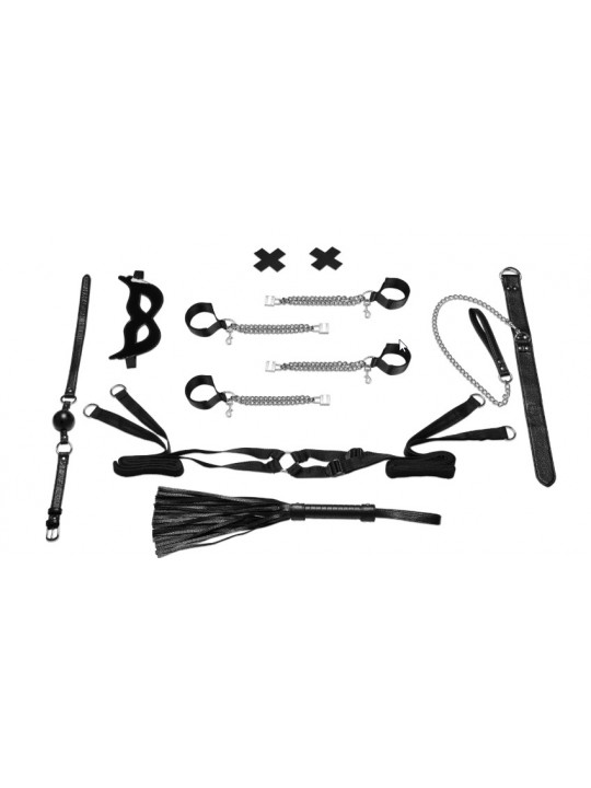 Este conjunto de cama de bondage com correntes inclui algemas para posicionar e conter sua parceira, além de acessórios essenciais para bondage, como adesivos para mamilos, uma máscara de dominação com olho-de-gato e uma coleira e guia para seu "animal de estimação" selvagem e erótico.
