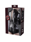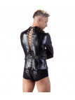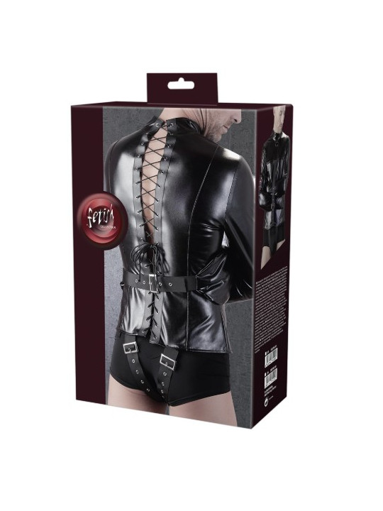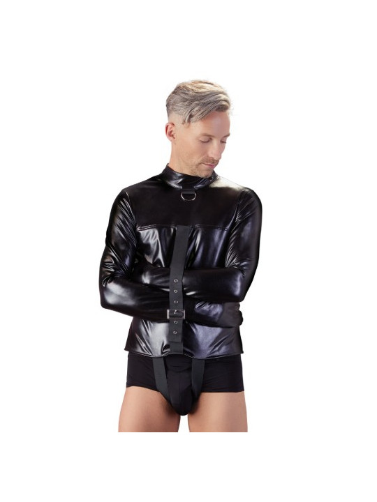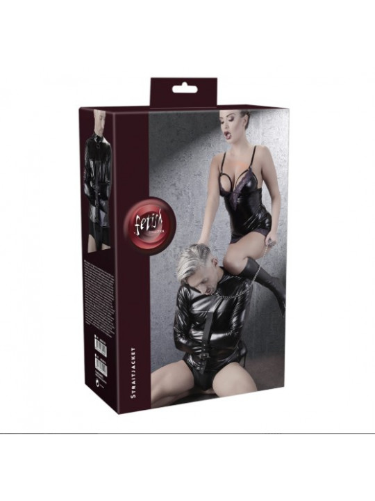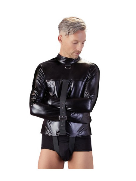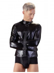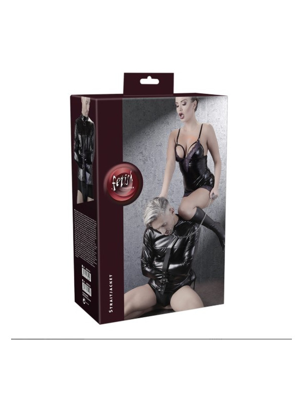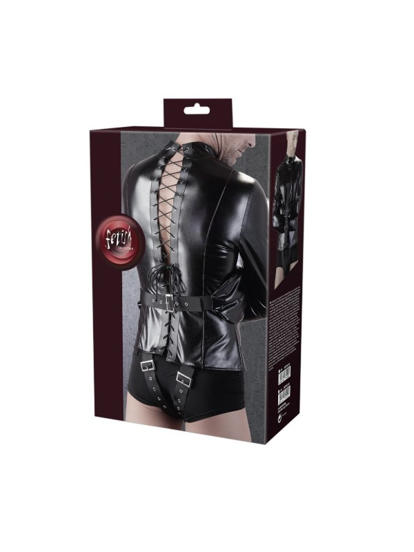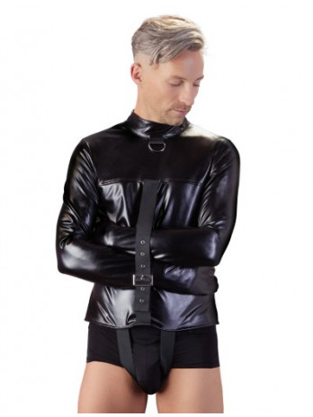 Camisa de força com alças ajustáveis sobre a virilha. As mangas largas têm fivelas extras. Há uma alça adicional para os braços na frente para fixá-los no lugar e garantir ainda mais a cativação. Também pode ser ajustada. A camisa de força tem uma aparência de alta qualidade devido ao couro sintético elástico com que é feita. A elegante gola alta e o anel em D na frente completam a aparência perfeita de bondage. 98% Poliéster, 2% elastano, revestimento de poliuretano.