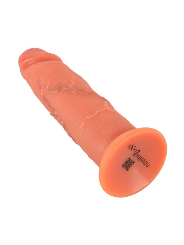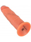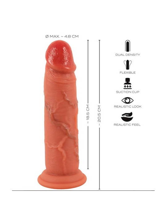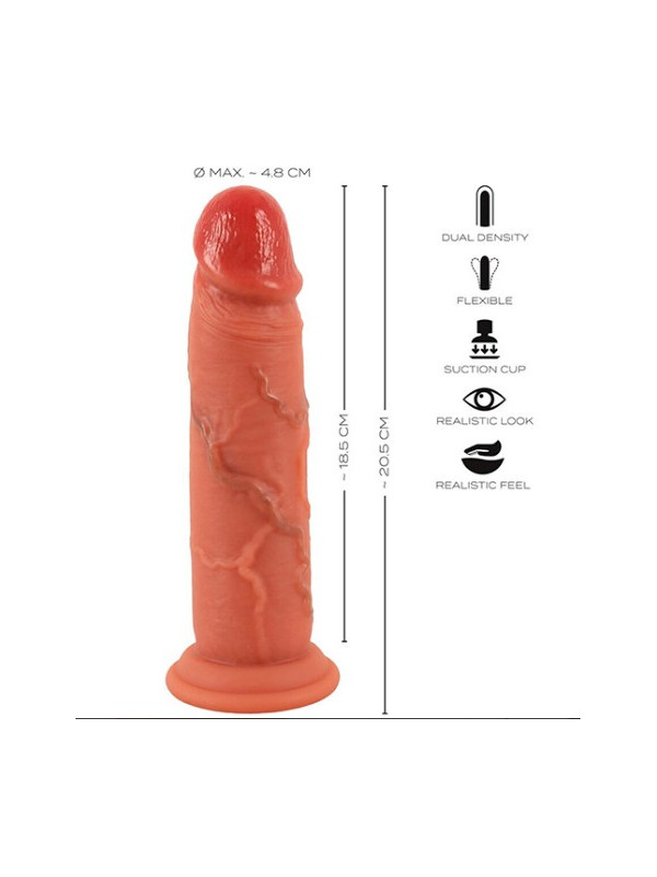 Dildo realista de silicone camada dupla (Dual Density) com 20,5 cm de comprimento total, 18,5 cm de profundidade de penetração e 4,8 cm de diâmetro máximo.